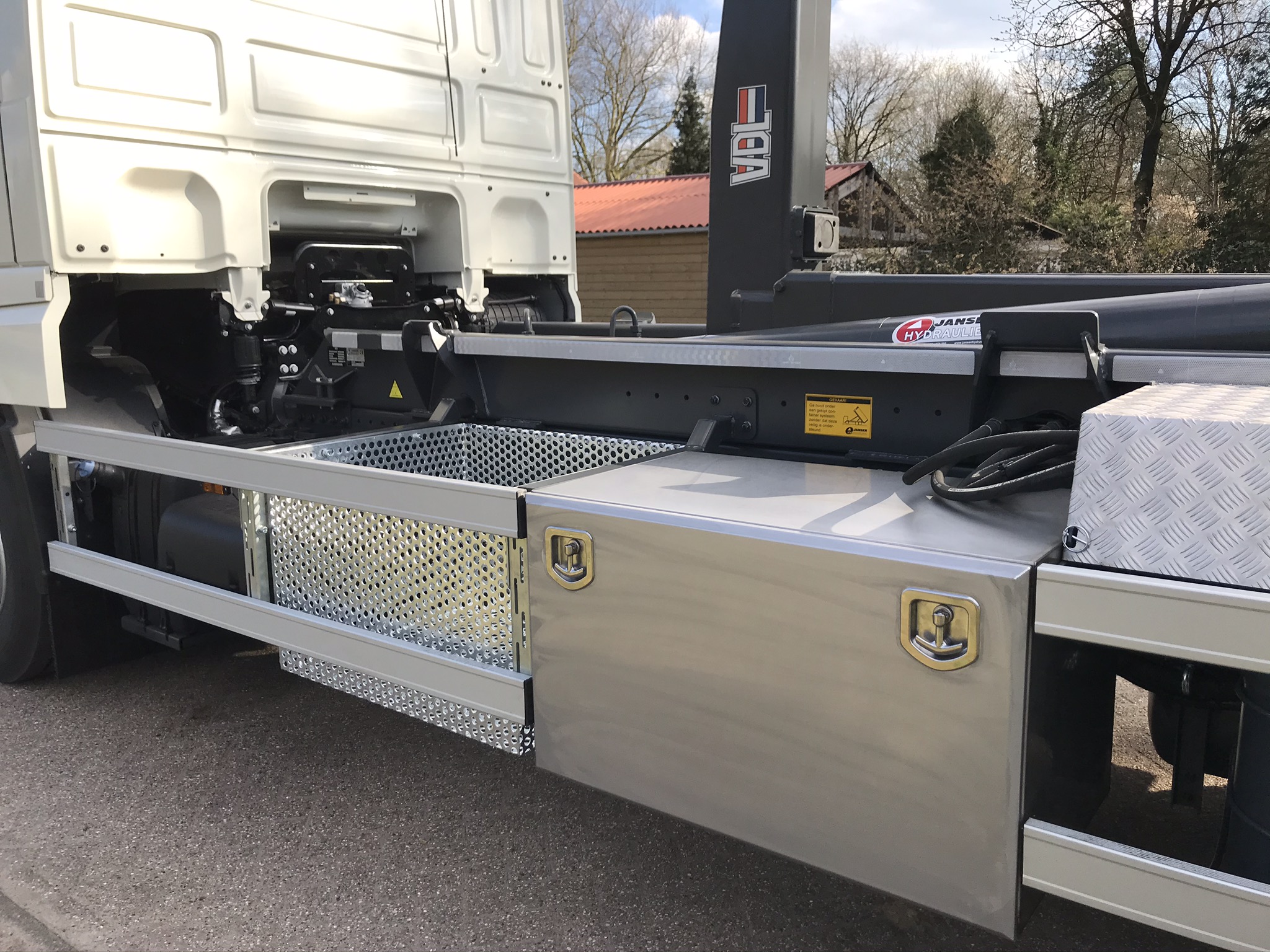 Met mechanische schuifbumper, zeilenrekken en een RVS gereedschapskist.