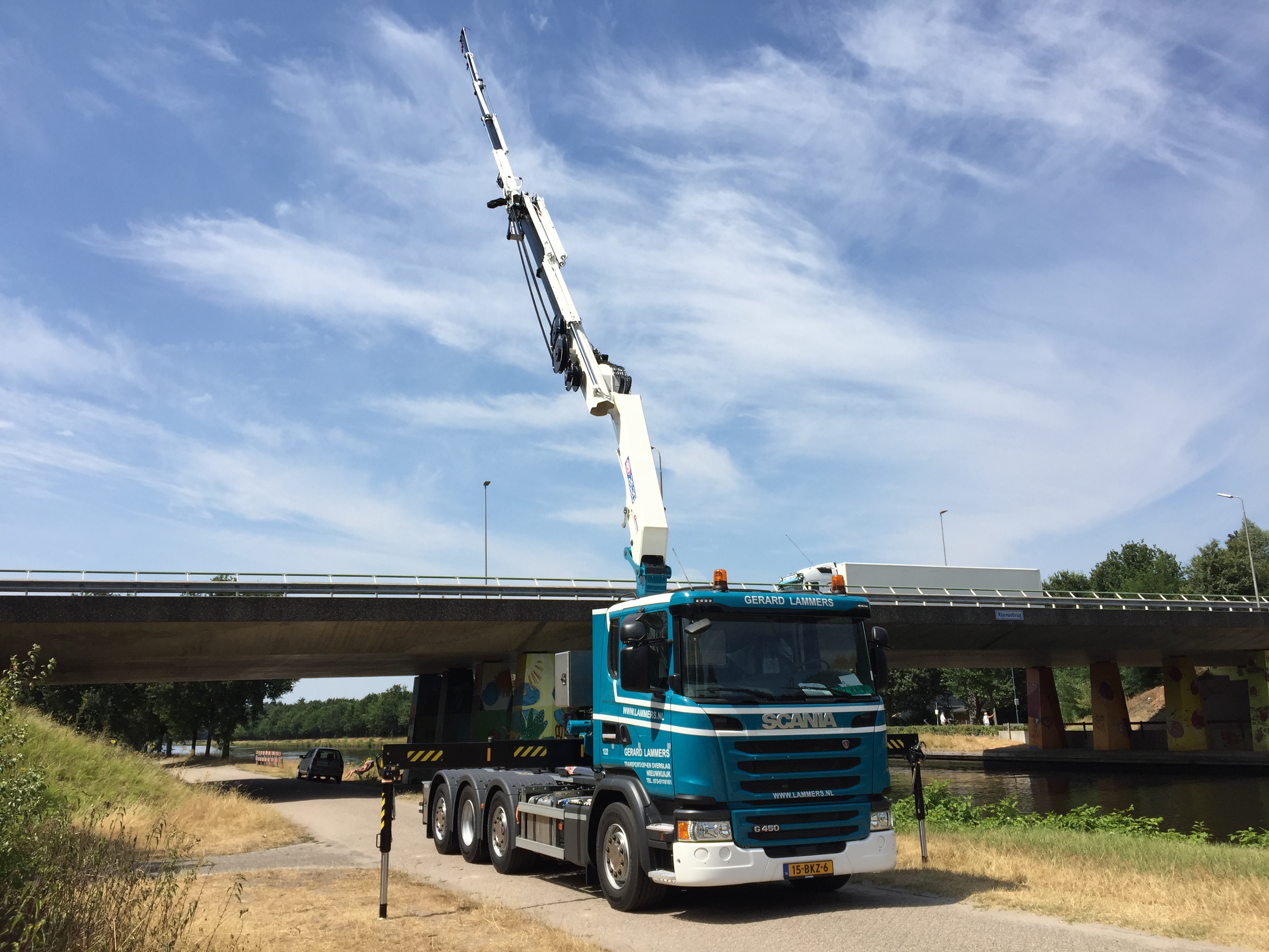 HMF autolaadkraan met een JHS haakarmsysteem voor Transportbedrijf Gerard Lammers