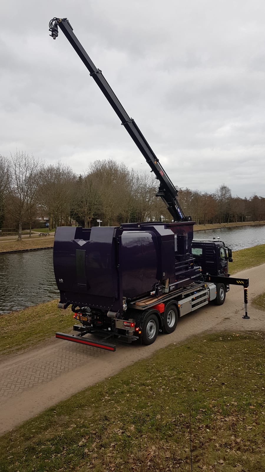 HMF autolaadkraan met een JHS haakarmsysteem en een AW was- en zuigunit voor Gemeente Breda