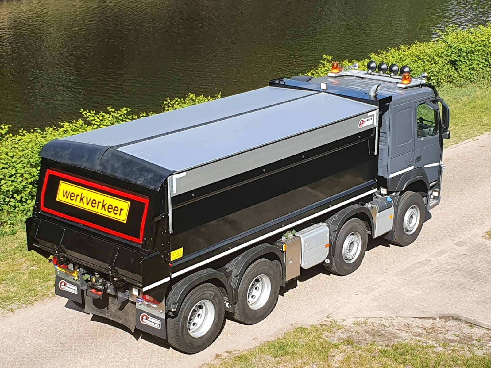 Volledig geïsoleerd met isolatiemateriaal en volledig afgelaste beplating. Met hydraulische asfaltsnip met oprijbrug voorziening en RVS gereedschapskist.