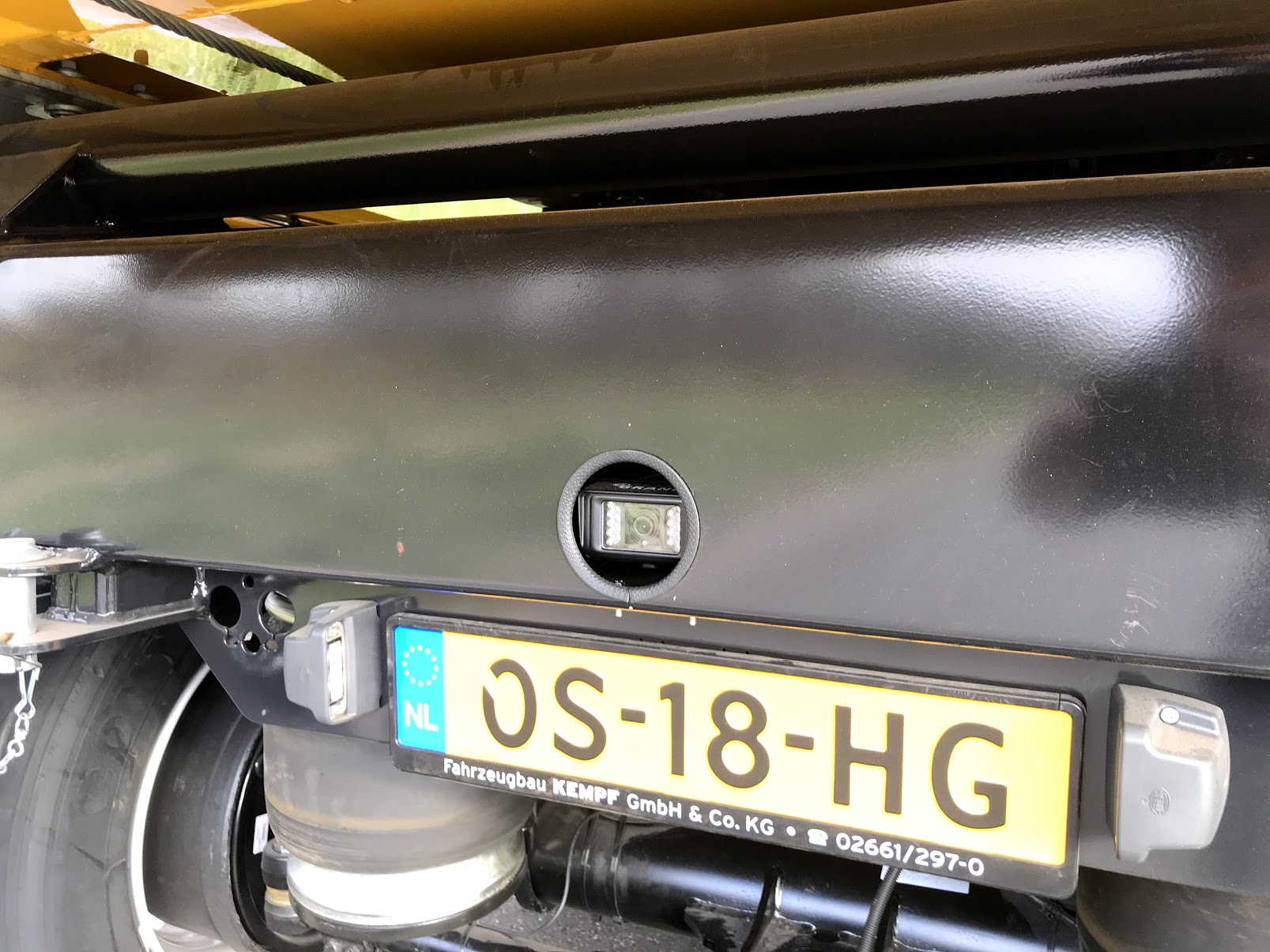 Deze stalen kippertrailer is geïsoleerd met isolatiemateriaal en heeft een ingebouwde camera aan de achterzijde. Op de Volvo trekker hebben wij een complete JHS hydrauliek set opgebouwd en bij de trap aan de bijrijderskant een camera.