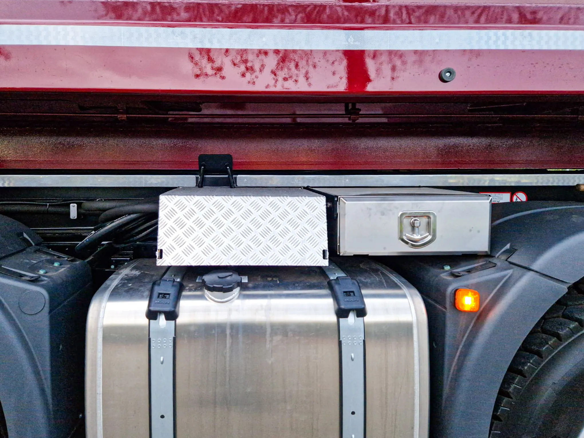 De combinatie wordt compleet gemaakt met een Hardox kippercontainer, uitgevoerd met multikappen en gespoten in metallic kleuren door onze eigen spuiters.