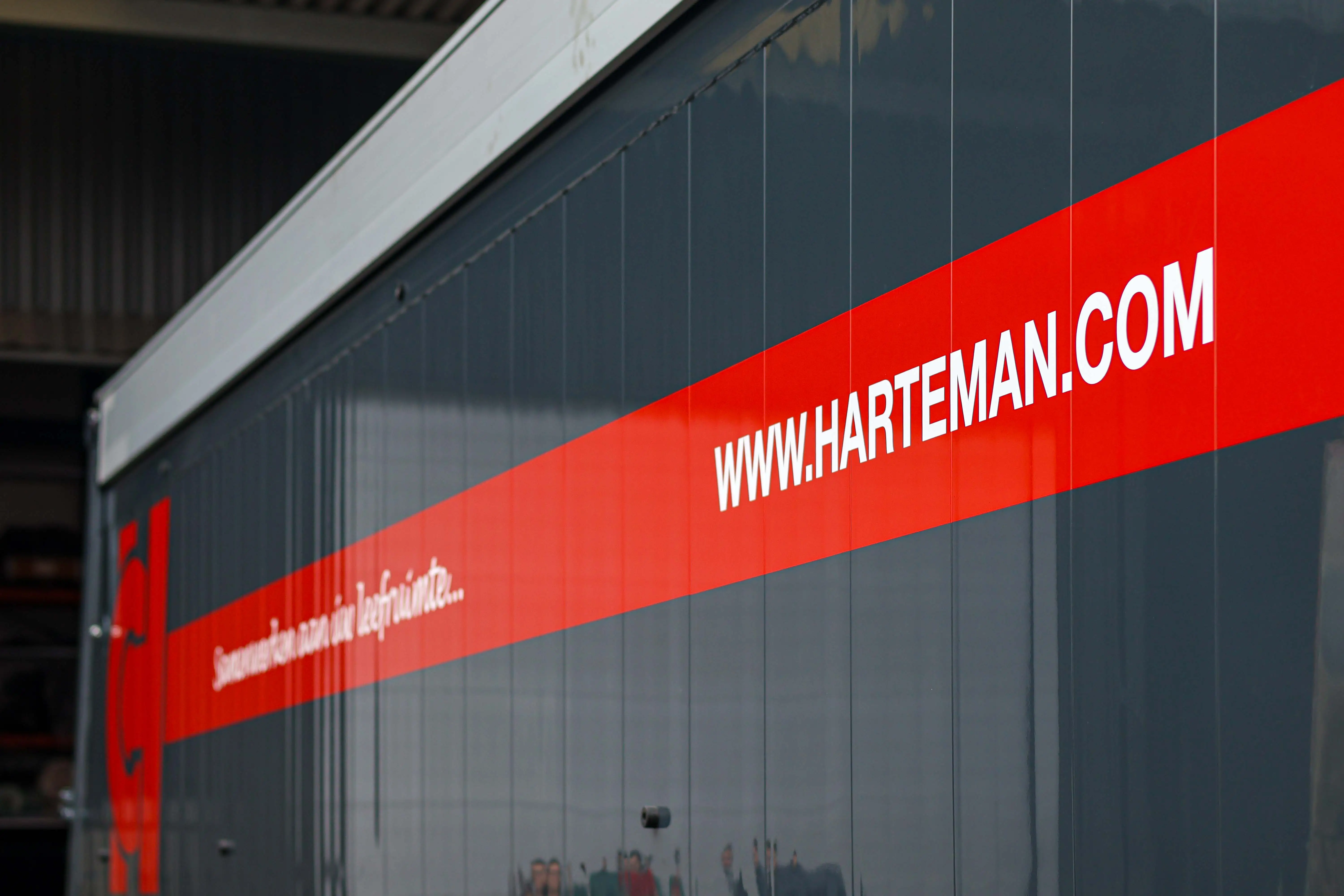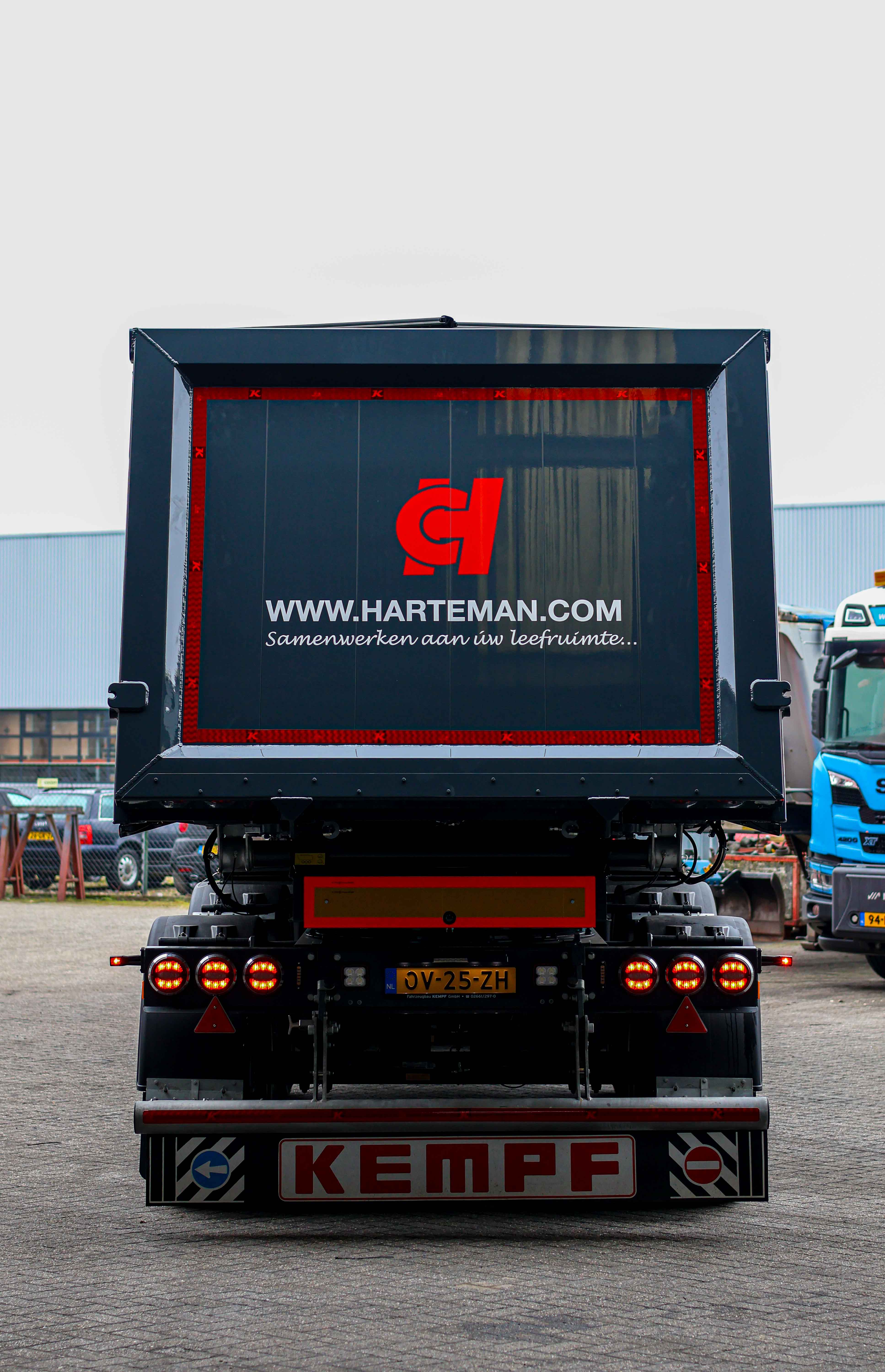 De trailer is uit voorraad geleverd en volledig overgespoten in onze eigen spuiterij, in de herkenbare huisstijl van Harteman. Zo sluit het geheel naadloos aan op de bestaande vloot.